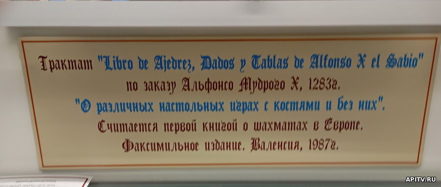 В Музее Центра шахматной культуры и информации ГПНТБ в самом сердце экспозиции располагается бесценный раритет – «Книга Игр» Альфонса X Мудрого. Это репринт знаменитого фолианта, который был подарен знаменитому советскому и российскому популяризатору шахмат Юрию Львовичу Авербаху, когда он посещал Испанию. «Книга игр» Альфонса Х Мудрого, которая была издана в 1230-м году, – это первая европейская книга о шахматах. Гравюры к ней писали на протяжении 25 лет. Юрий Авербах досконально изучил мельчайшие детали гравюр, и сделал на основании их анализа много выводов о быте средневековой Испании. Он сумел решить все задачи, несмотря на то, что правила игры тогда сильно отличались от современных. «Книга Игр» Альфонса X Мудрого Книга Игр, созданная по заказу короля Альфонса X Мудрого (Альфонсо Х Мудрый), представляет собой уникальный памятник средневековой культуры. Этот манускрипт, состоящий из 98 листов пергамента и украшенный 150 яркими цветными иллюстрациями, стал одним из первых значительных произведений европейской литературы, написанных на живом народном языке своего времени.