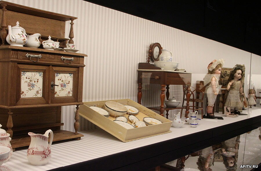 Особое внимание уделяется воссозданию атмосферы детских комнат рубежа XIX–XX века, наполненных игрушками, которые помогали девочкам учиться ведению домашнего хозяйства: миниатюрная плита с набором кастрюль, швейная машинка, кукольные и детские сервизы. Девочкам с раннего детства прививали вкус и желание следовать моде, о чем говорят не только обширные кукольные гардеробы, но и модные журналы. «Мы планировали продемонстрировать многообразие кукол XIX век и показать, что каждая из них несла в себе определенную воспитательную функцию. Наряды кукол были созданы в строгом соответствии с модой и этикетом той эпохи. Источники происхождения костюмов различались: некоторые фабрики привлекали профессиональных модельеров для разработки нарядов, существовали и домашние мастерские, где приглашенная модистка сначала одевала членов семьи, а затем создавала аналогичные костюмы для кукол из тех же тканей», - сообщила Диана Панская. Технический прогресс отразился, прежде всего, на производстве игрушек для мальчиков. В экспозиции представлена детская железная дорога начала ХХ века изготовленная фирмой «Märklin». Изделия этой фирмы были в игровой комнате цесаревича Алексея в Царском Селе. Российское производство металлических игрушек показано предметами фабрики П.П. Талаева, работавшей в Подмосковье в 1910х годах.
