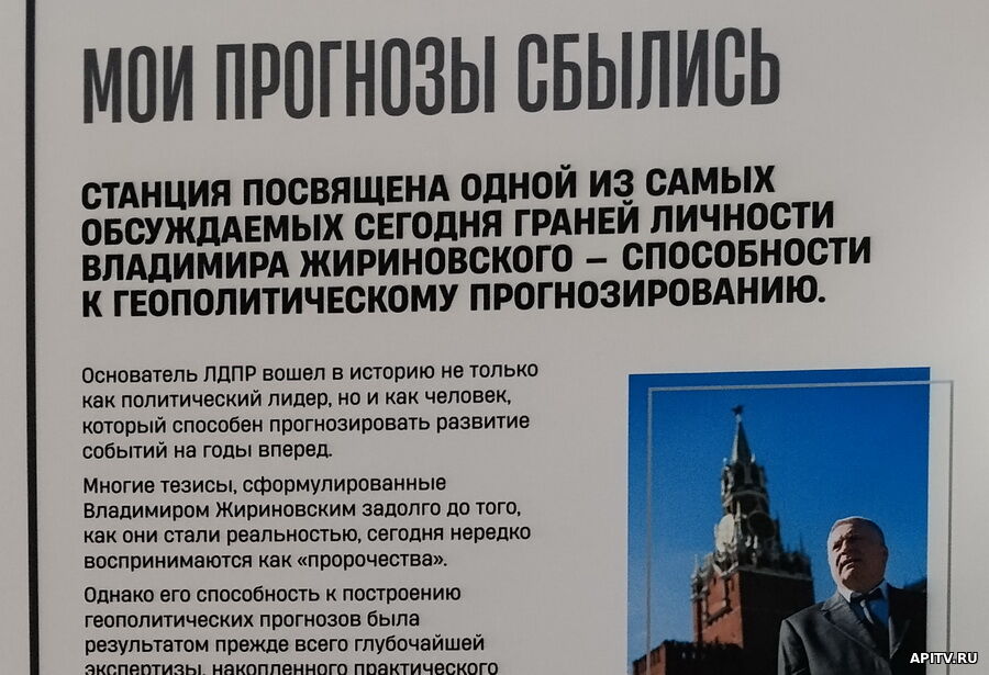 Станция «Пророк или аналитик?»: Один из самых интересных разделов выставки. Здесь собраны прогнозы и высказывания Жириновского о будущем России и мира, сделанные им в 90-е и 2000-е годы. Многие из них сегодня воспринимаются как сбывшиеся пророчества — от геополитических конфликтов до путей развития страны. Экспозиция ставит перед зрителем вопрос: было ли это даром предвидения или результатом глубокого анализа ситуации?