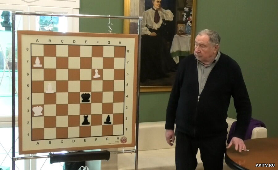 Первым взялся за дело Николай Кралин, известный шахматный композитор (автор шахматных этюдов – прим.автора), чемпион СССР. На доске он представил свои авторские этюды, посвященные, прежде всего, Ивану Тургеневу, большому почитателю шахмат. Публика реагировала живо, разбирая ту или иную композицию.