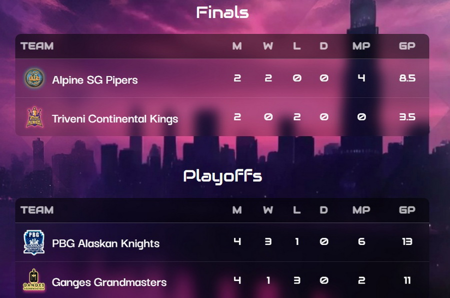 PBG вернулась в третий сезон, балансируя на краю пропасти. После четырёх поражений подряд в начале турнира им удалось вернуться в середину турнирной таблицы и постепенно выйти в финальную стадию. Для команды Ganges Grandmasters круговая стадия турнира была чередой взлётов и падений. Лучшим игроком команды на протяжении всего турнира был Джавохир Синаров, восходящая звезда из Узбекистана, который недавно выиграл один из самых сложных шахматных турниров на планете — Кубок мира в Гоа. Арджун Эригаиси был самым стабильным игроком PBG, но именно их легендарный игрок Гукеш — действующий чемпион мира — несмотря на то, что турнир выдался для него непростым, одержал решающую победу в финальном раунде all-play-all и вывел свою команду в финальную стадию. На заключительном этапе турнира очки начислялись так же, как и в других шахматных турнирах: за победу — одно очко, за ничью — по пол-очка.