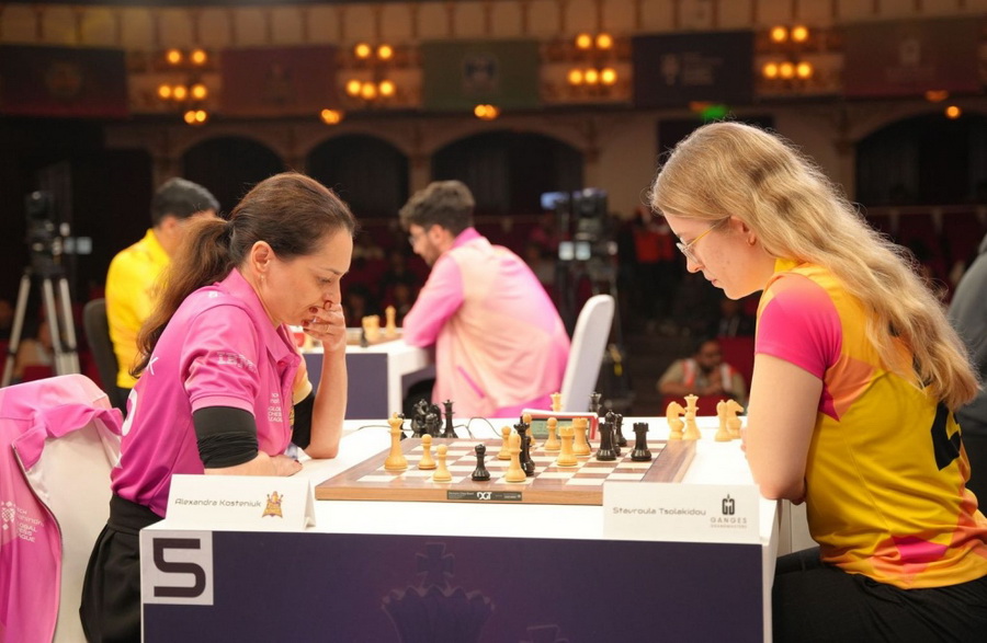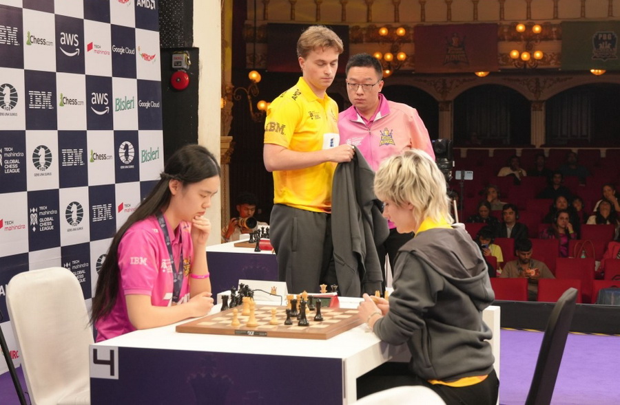 Матч 10: Fyers American Gambits против Alpine SG Pipers (4–10) Четвёртый день начался со столкновения двух команд, только что одержавших крупные победы. В третий день команда Fyers American Gambits шокировала действующих чемпионов Triveni Continental Kings, обыграв их со счётом 10–8 после того, как Володар Мурзин превратил проигранную позицию в победную . Команда Alpine SG Pipers наконец прервала свою неудачную серию, обыграв команду upGrad Mumbai Masters со счётом 9–7 благодаря тому, что Леон Люк Мендонка поставил мат в ещё одной решающей партии. «Гамбит» начал раунд с шестью матч-пойнтами, «Пипаерс» — с тремя. Все взгляды были прикованы к доске, где Хикару Накамура противостоял Фабиано Каруане. Две звезды из США проверяли друг друга в классической защите Петрова. Большую часть игры это была чисто теоретическая битва между двумя хорошо подготовленными игроками, и многие ходы, которые казались зрителям странными, на самом деле были теоретическими. После нелогичного хода короля Kd7 Накамура спокойно вздохнул. Затем Каруана пошёл на разменную жертву, сдвинув свою пешку h. Позиция выглядела напряжённой, но игроки знали, что она сбалансирована. После 59 ходов они согласились на ничью в равном эндшпиле. Аниш Гири и Владислав Артемьев также достигли сбалансированной позиции, в которой ни одна из сторон не могла добиться реального прогресса, и вскоре сыграли вничью. На второй доске всё прошло по схожему сценарию. Праггнанандхаа и Ричард Раппорт разыграли редкую линию в староиндийской защите. Раппорт, как обычно, играл творчески, а Прагг не терял контроля. Игра оставалась равной и закончилась очередной ничьей. Настоящая драма матча развернулась на женских и детских площадках. Хоу Ифань, бывшая чемпионка мира по шахматам среди женщин, встретилась с Бибисарой Асаубаевой. Хоу создала «больную» пешку e6 в сицилианской защите Алапина, и позиция стала явно лучше, но она не нашла лучшего продолжения и вместо этого пожертвовала пешку. Приняв жертву, Бибисара терпеливо защищалась и довела партию до ничьей. Теодора Инджак, игравшая королевским гамбитом против Нино Бациашвили, большую часть партии была явно сильнее, оказывая давление и вынуждая Нино защищаться. Затем, за три хода, всё изменилось. Позиция перевернулась, и у Инджак стало заканчиваться время. Бациашвили тоже допустила ошибку, позволив чёрным выиграть слона за две пешки. В наступившем эндшпиле шансы были примерно равны, но Инджяк не могла найти верный путь. Ход за ходом она помогала белым продвигать пешки на ферзевом фланге. Бациашвили, в свою очередь, позволила сопернице блокировать пешки на тёмных полях, снова обеспечив чёрным решающее преимущество. Однако, когда пришло время собирать эти проходные пешки, Инджяк допустила пару ошибок, позволив белому королю проникнуть на королевский фланг. После размена ладей у Инджака остался только слон, в то время как у Бациашвили три пешки двигались вперёд. В последовавшей за этим борьбе за время Теодора совершила серьёзную ошибку, переместив своего короля обратно на e7 (вместо того, чтобы переместить его на e5 и сравнять счёт), что сразу же изменило оценку с «равные» на «чёрные проиграли». Нино продемонстрировала хороший технический контроль и реализовала своё преимущество. «Волынщики» набрали три важных игровых очка и вышли вперёд со счётом 7–4. На доске для вундеркиндов Леон Люк Мендонка снова ста
