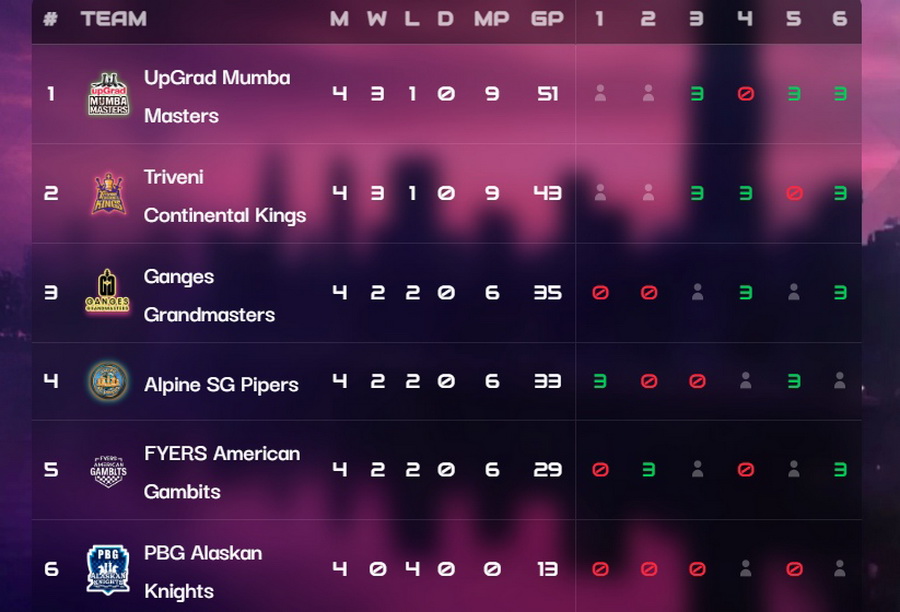 Четвёртый день Глобальной шахматной лиги Tech Mahindra изменил расстановку сил в верхней части турнирной таблицы. Команда upGrad Mumbai Masters разгромила PBG Alaskan Knights со счётом 18:2, Triveni Continental Kings одержали победу над Ganges Grandmasters со счётом 11:6, а Alpine SG Pipers обыграли Fyers American Gambits со счётом 10:4 и сохранили свои позиции. Это был день, когда фавориты показали свою силу. Triveni сразу же оправились от поражения в матче с Gambits, а Алиреза Фирузджа и Вэй И возглавили борьбу с Ganges. upGrad отыгрались после поражения от Alpine, безжалостно расправившись с PBG, а Pipers подтвердили своё возрождение, когда Нино Бациашвили и Леон Люк Мендонка снова показали себя. Единственной командой, которая не смогла остановить спад, стали «Найтс», потерпевшие четвёртое поражение подряд. После четырёх раундов команды upGrad Mumbai Masters и Triveni Continental Kings делят лидерство с девятью очками в турнирной таблице, при этом upGrad немного опережает по очкам за игру (51 против 43). Команды Ganges Grandmasters, Fyers American Gambits и Alpine SG Pipers идут плотной группой с шестью очками в турнирной таблице каждая и по-прежнему сохраняют шансы на победу. Команда PBG Alaskan Knights находится в самом низу с нулём очков, и для того, чтобы у неё появилась хоть какая-то надежда вернуться в турнирную таблицу, ей нужно идеально завершить игру.