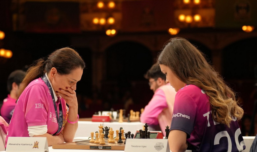 Матч 8: Triveni Continental Kings против Fyers American Gambits (8:10) В очень острой позиции Александра Костенюк оказалась с двумя второстепенными фигурами против ладьи и пешки Теодоры Инджяк. Позиция долгое время оставалась сбалансированной, но Инджяк допустила ошибку, заведя своего короля в матовую сеть. Костенюк завершила партию матом с помощью пешки — редкое явление в шахматах высшего уровня. Эта победа принесла ей три очка и сравняла счёт в матче. Алиреза Фирузджа и Хикару Накамура разыграли острый вариант принятого ферзевого гамбита, в котором у чёрных осталась слабая пешка на e6. Фирузджа расположил свои фигуры на оптимальных полях вокруг этой цели, а затем усилил своё ферзевое большинство. Накамура защищался изобретательно, но ему пришлось потратить много времени, чтобы найти точные ходы. Пропустив ключевую идею защиты, он позволил Фируздже разменять ферзей и создать неудержимый с-пассер. Накамура сдался, и Тривени вышел вперёд. После этих трёх решающих партий счёт был 6:4 в пользу Тривени. Владислав Артемьев (Gambits) получил небольшое преимущество над Вэй И в венской партии. Однако позиция белых была достаточно прочной, чтобы игрок уровня Вэя мог удержать её с помощью точной защиты. Игроки повторили ходы и согласились на ничью. Женская партия между Бибисарой Асаубаевой (Gambits) и Чжу Цзинер развивалась по другому сценарию. Асаубаева получила лучшую позицию и продолжила наступление. В критический момент она совершила серьёзную ошибку, которая полностью изменила ход игры. Белые получили решающее преимущество, но затем настала очередь Чжу дрогнуть. Партия перешла в окончание с разнополярными слонами, в котором у белых не было шансов на победу, несмотря на лишнюю пешку. Вскоре партия закончилась вничью. После завершения игры на четырёх досках и по одной победе у каждой из сторон, а также двух ничьих, «Тривени» по-прежнему опережали соперника на два игровых очка — 8:6. Марк’Андрия Маурицци и Владимир Мурзин разыграли очень острый сицилианский вариант. Маурицци получил более выгодную позицию и усилил давление, продвинув свои пешки на королевском фланге. Поскольку у него было больше времени и инициатива на доске, казалось, что Тривени может одержать ещё одну победу в матче. Но напряжение и время начали сказываться. Сначала белые преждевременно ослабили напряжение на королевском фланге, дав чёрным некоторую передышку, а затем отдали пешку h, позволив Мурзину создать очень опасную проходную пешку, которая решила исход игры в пользу «Гамбитс». Победа Мурзина с чёрными фигурами принесла команде четыре игровых очка и переломила ход матча. Итоговый счёт составил 10:8 в пользу Fyers American Gambits по игровым очкам. Они набрали три ценных очка в матче и нанесли Triveni Continental Kings первое поражение в сезоне. Для Gambits это был важный ответный ход после поражения от upGrad Mumba Masters во второй день.
