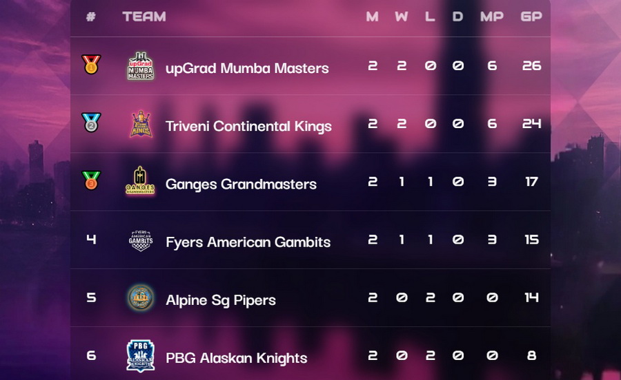 Только две команды сумели удержать идеальный старт после окончания второго игрового дня: Triveni Continental Kings уверенно одолели PBG Alaskan Knights, выиграв со счетом 15:3. Остальные коллективы испытали трудности, завершив матчи с меньшими результатами. Как начинался день? Три команды успешно выступили в первый день турнира, набрав максимум возможных баллов: Triveni, upGrad и Fyers. Их ближайшим преследователям (Alpine, Ganges и PBG) оставалось лишь догонять. Вторая сессия в Королевском оперном театре вновь показала зрителям зрелищные баталии, эмоциональные ситуации и драматичные финалы партий. Матчи подробно Матч №4: Fyers American Gambits vs upGrad Mumba Masters Началом дня стало противостояние вчерашних победителей. Fyers, обогнавших накануне PBG со счетом 8–5, встретились с великолепно сыгравшей upGrad, разгромившей Ganges со счетом 17–4. Партии проходили довольно ровно, но первая потеря произошла на главной доске. Шахрияр Мамедьяров победил Ричарда Раппорта, обеспечив своей команде три важных балла. Затем удача отвернулась от Хакуру Накамура, чья игра завершилась поражением от Максима Вашье-Лаграва. Другие партии принесли либо ничьи, либо минимальное преимущество upGrad. Финальный счет: 9–7 в пользу upGrad. Матч №5: Alpine SG Pipers vs Ganges Grandmasters Alpine пришли к этому матчу с тяжелыми потерями после встречи с действующими чемпионами Triveni. Напротив, Ganges получили моральную поддержку, хотя ранее потерпели одно из худших поражений турнира. Ключевой перелом произошел на доске суперзвёзд. Аниш Гири удачно применил английский дебют против Винсента Кеймера, но слабость часов помешала завершить партию победой. Несмотря на ничью, успех пришел от Фабиано Каруаны, который победил Висванатана Ананда, отдавшего решающее очко. Позже отличился и молодой талант — Раунак Сахдвани, взяв верх над Леон Люк Мендонкой. Полина Шувалова добавила очки, победив Хоу Ифан, тогда как Нино Бациашвили помогла команде удержаться в игре, обыграв Ставрула Цолаакиду. Однако финальная битва решила исход матча: Праггнанандхаа Р уступил Джавохиру Синдарову, позволив Ganges набрать дополнительные очки и закрепить победу со счетом 13–7. Матч №6: PBG Alaskan Knights vs Triveni Continental Kings Эти команды соперничают друг с другом давно, а финал прошлого сезона завершился победой Triveni. Сейчас обе стороны жаждали новых успехов. Несмотря на начальные усилия PBG, Triveni уверенно взяли лидерство. Уже на первых этапах все шесть досок показали максимальную конкуренцию, без явных фаворитов. Главные события произошли на женских досках. Тривени Чжу Цзинер победила Екатерину Лагно, продемонстрировав свое мастерство. Арджун Эригаиси и Вэй И тоже закончили вничью, закрепляя победу Triveni. Завершающим аккордом стала ошибка Даниэля Дарды, приведшая к поражению в последнем эндшпиле. Итог матча — 15–3 в пользу Triveni.