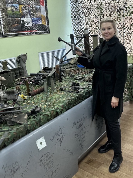 А история этого сотрудничества началась весной: участники проекта впервые посетили «Барс-Курск» в апреле, на День космонавтики, приехали с проектом «Космос Навсегда», привезли концерт, стихи, видео-обращение от настоящих космонавтов. Особое впечатление оставила индивидуальная экскурсия, которую для гостей устроили в мини-музее на территории "Барс-Курск".В экспозиции — реальные артефакты и обломки, собранные своими руками: каски, дроны , оружие, и сама «Баба Яга». Остановились у уголка памяти — здесь хранят фотографии бойцов, которых уже нет с нами, но они навсегда в музее. Живые гвоздики у их портретов — маленький знак большой памяти. Командир отряда с удовольствием сфотографировался с гостями.
