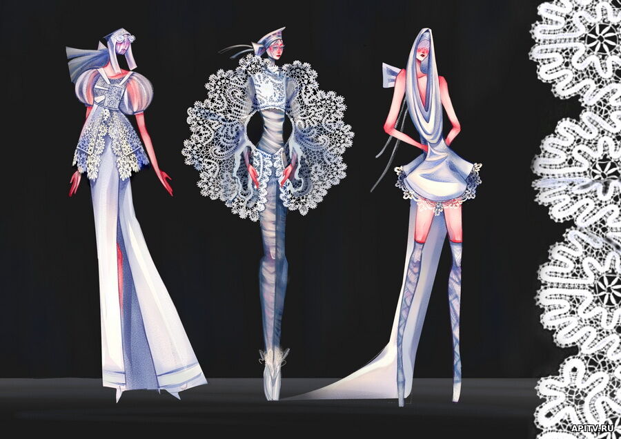 Среди победителей в номинации «Эскизы» оказалась 18-летняя Дарья Полякова, студентка четвёртого курса колледжа имени Карла Фаберже. Она представила на конкурс свои эскизы для коллекции "Русская Атлантида — Северные сказания". «Коллекция "Русская Атлантида — Северные сказания" появилась благодаря моей поездке на Север России, куда я отправилась за вдохновением. Я побывала в Вологде, Костроме, Ярославле, Ростове Великом, Переславле-Залесском, Сергиевом Посаде и Архангельске. Из всех перечисленных городов и их музеев я выделила невероятное богатство русского народного костюма и разнообразие головных уборов, которые меня особенно зацепили в северных губерниях нашей Родины», - рассказала Дарья Полякова. Главным источником вдохновения для дизайнера стала реальная история о "Русской Атлантиде" — затопленных деревнях России, появившихся в 1963 году при наполнении Шекснинского водохранилища. Среди прочих было затоплено село Крохино, которое являлось самобытным центром древней русской культуры; теперь от него осталась только одинокая церковь-маяк. «Эта история очень тронула и поразила меня, и я решила создать коллекцию, отражающую потерю и восстановление, старое и новое, надежду и сохранение наследия в современном прочтении. Мне хотелось обыграть тему ухода под воду, не забывая, что речь идёт о Севере. Поэтому модели похожи на русалок из народных сказок: бледная кожа, ресницы из белого кружева и прикрытие лица тканями и украшениями», - поделилась Дарья.