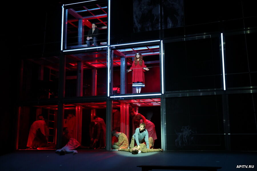 Сцена разделена на две плоскости - горизонтальную и вертикальную. Конструкция из кубов-комнат, в каждом кубе по ходу действия появляется свой персонаж – своеобразный иконостас Лавра. В нем находится место и для погибшей Устины, и для любимого деда Христофора, и для Рассказчика, и для старца Никандра.
